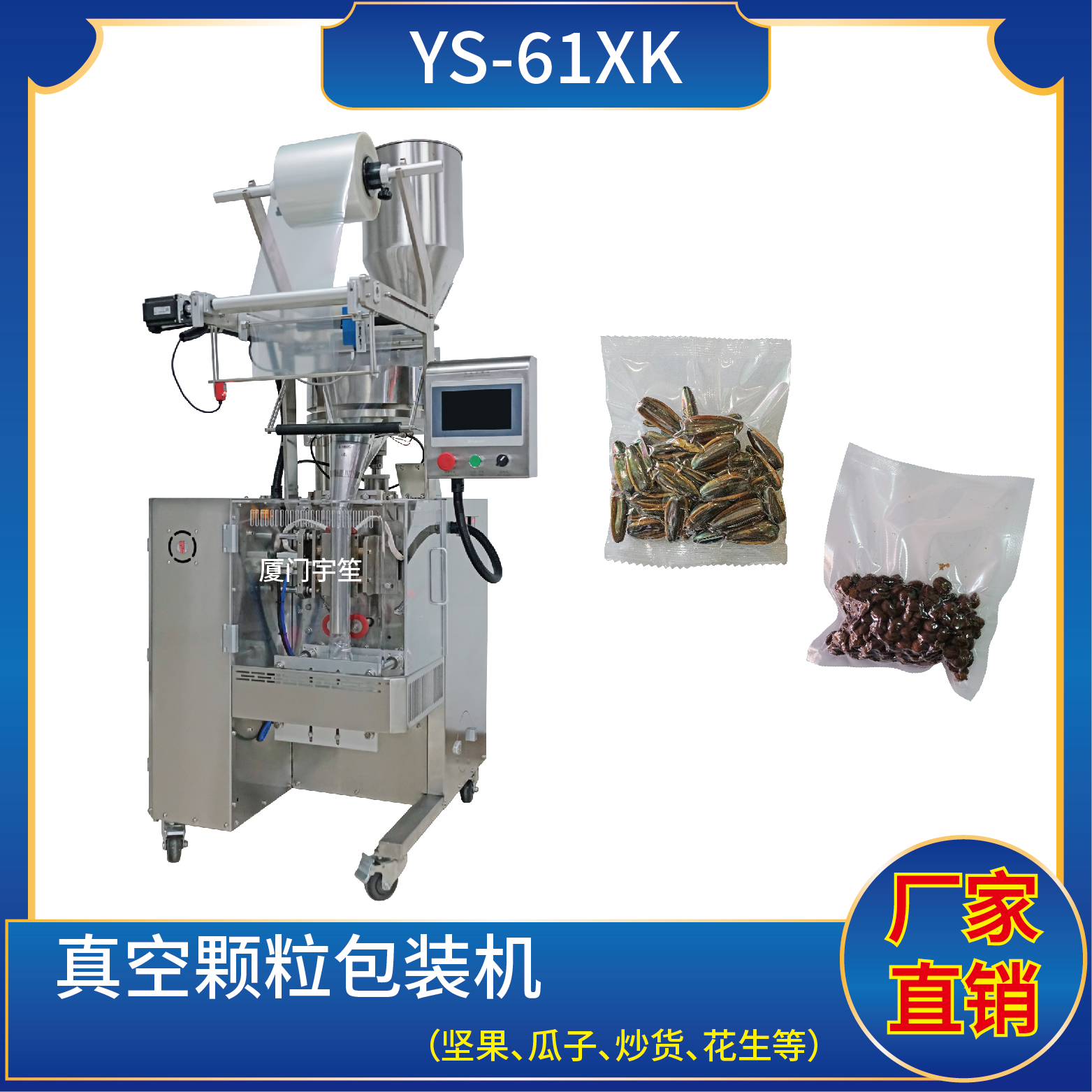 1、適用于食品行業(yè)中干果、炒貨、干菜等顆粒物品的真空計(jì)量包裝,防止食品的霉腐變質(zhì),保持食品的色香味,延長(zhǎng)保質(zhì)期。