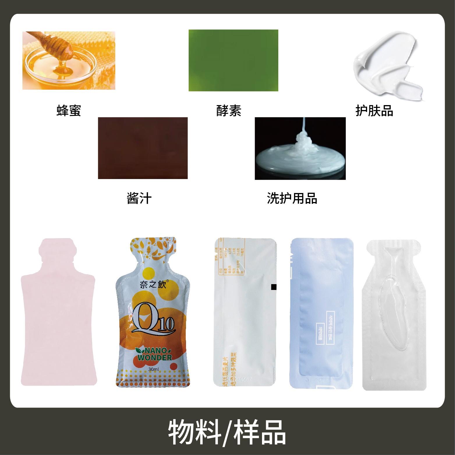 Suitable for the double-row irregular bag metering and packaging of pastes and liquids like enzymes, fruit juices, mouthwash, toiletries, hair dyes, and cosmetic sample sachets in various industries.